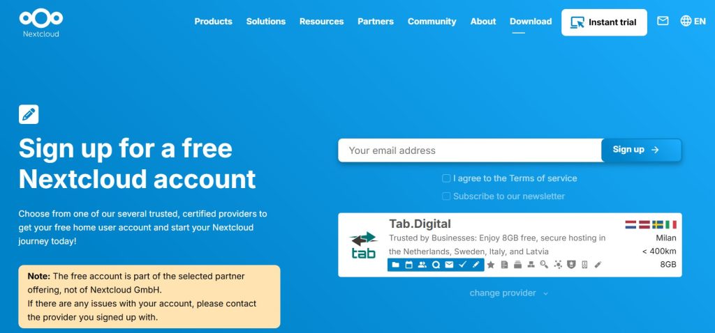 For an average user, the best and really only choice is to sign up with a Nextcloud partner. You will use Nextcloud by logging into a web-based account that gives you file storage, syncs with your PC and other devices, and includes a fully functioning office suite. It’s 100% private and secure. No ads. No tracking. No data collection. No personal information is asked for apart from your email address. You don’t even need to input a payment card unless you decide to upgrade for more storage space.